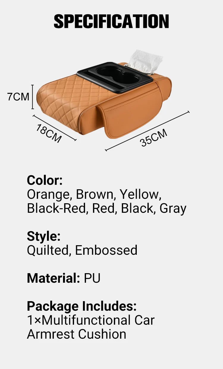 Premium PU-leather quilted construction in seven sophisticated colors. At 35cm wide with smart side compartments, it's sized to fit most vehicles and designed to complement any interior. Everything you need, nothing you don't.